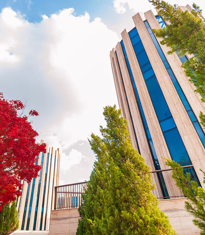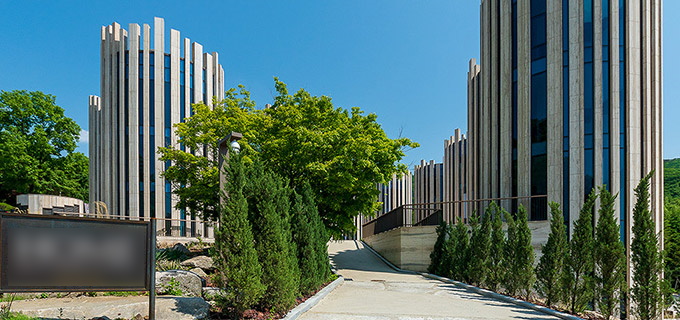 나무들 사이 우뚝 솟은 품격있는 건물.