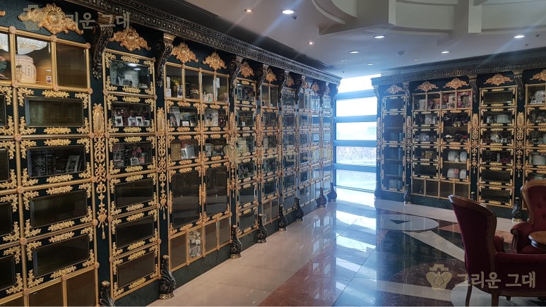 위 사진은 특별실(금잔화실)입니다. 골드와 전통 칠보로 꾸며진 최고급 가족 봉안당입니다.